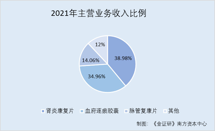 经《金证研》南方资本中心计算,2019-2021年和2022年1-6月肾炎康复片、血府逐瘀胶囊和脉管复康片三大主要产品收入合计分别为6.31亿元、7.11亿元、8.9亿元、4.87亿元,占营业收入的比例分别为84.76%、86.85%、88%、88.88%。