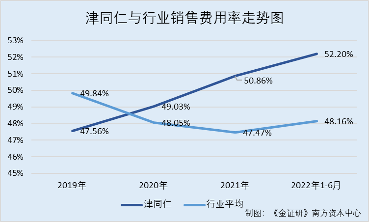 据首轮问询回复,2019-2021年以及2022年1-6月,津同仁营业收入分别为7.45亿元、8.18亿元、10.12亿元、5.48亿元。同期,津同仁销售费用分别为3.54亿元、4.01亿元、5.15亿元、2.86亿元。